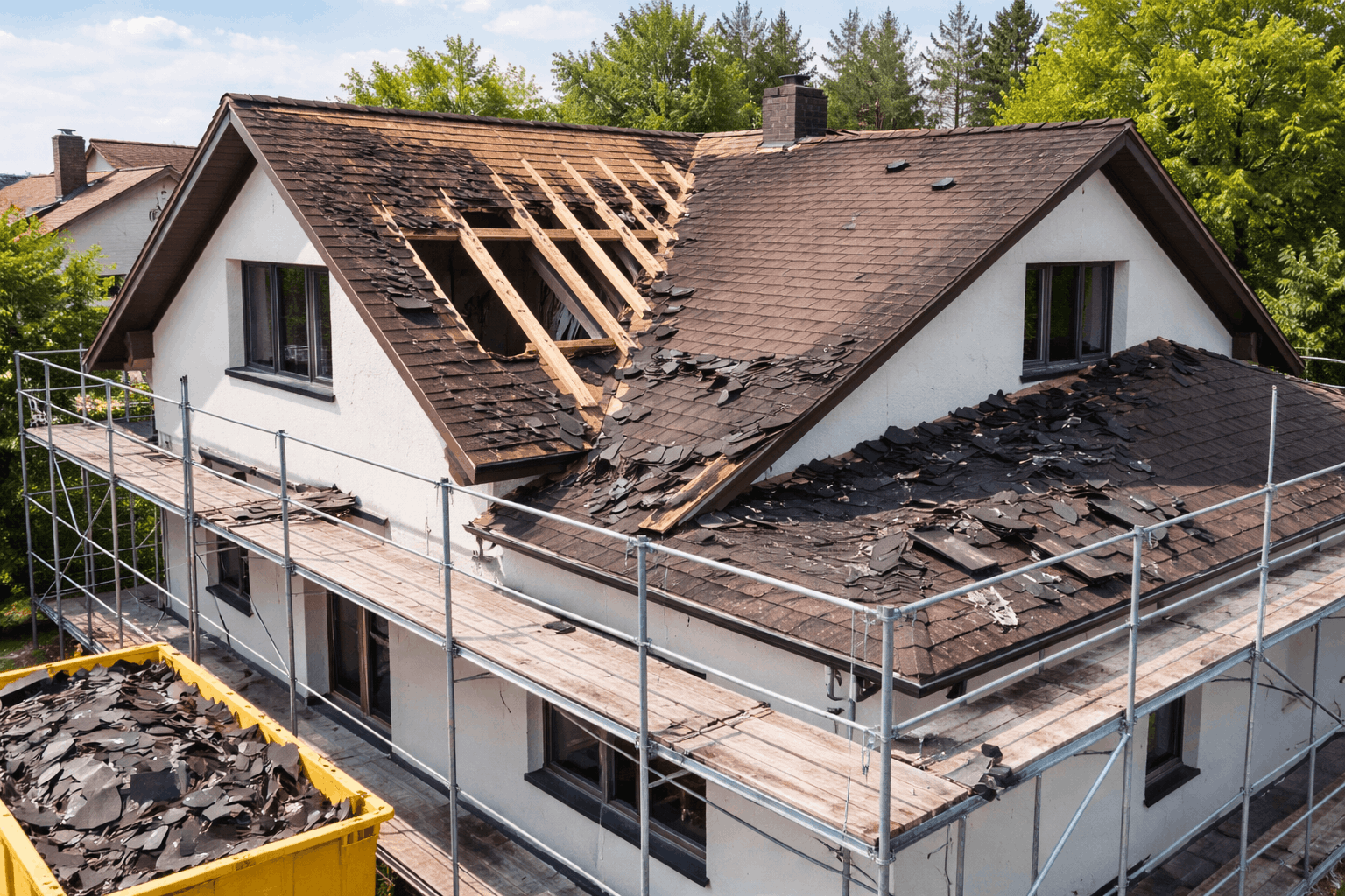Acest proiect a constat în reabilitarea completă a unui acoperiș existent pentru o locuință individuală din Târgoviște, cu regim de înălțime P+1 și acoperiș în 3 ape. Intervenția a început cu demontarea integrală a învelitorii din șindrilă bituminoasă, inclusiv îndepărtarea straturilor suport deteriorate.În urma inspecției structurii, au fost identificate zone afectate de infiltrații și degradări în timp, motiv pentru care s-a intervenit punctual pentru înlocuirea elementelor compromise (căpriori, astereală), asigurând astfel refacerea rezistenței și stabilității acoperișului.Lucrările s-au desfășurat în condiții de siguranță, cu montaj de schelă perimetrală și evacuarea controlată a deșeurilor rezultate. Această etapă este esențială pentru pregătirea corectă a suportului înainte de montajul noii învelitori, garantând durabilitatea lucrării pe termen lung.